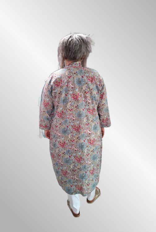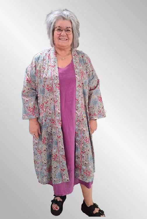Lækker bomulds kimono i smukt print, lommer, beregnet på at stå åbent.