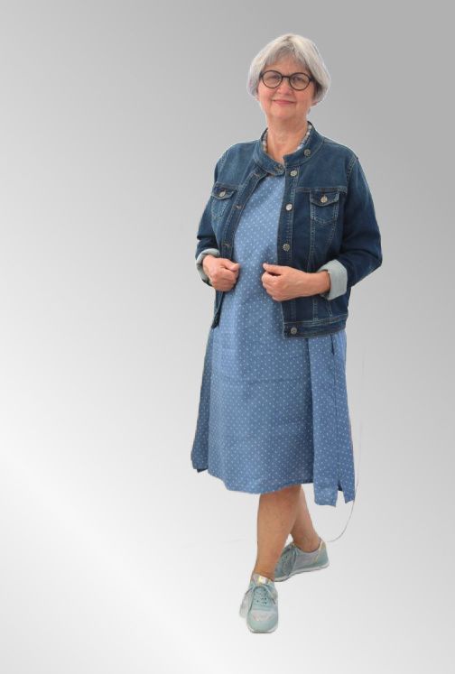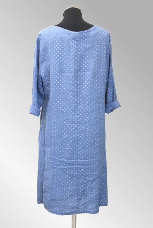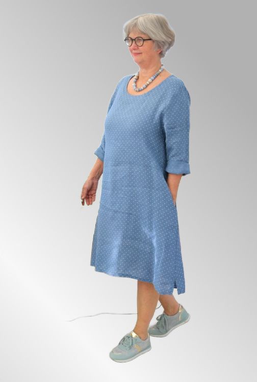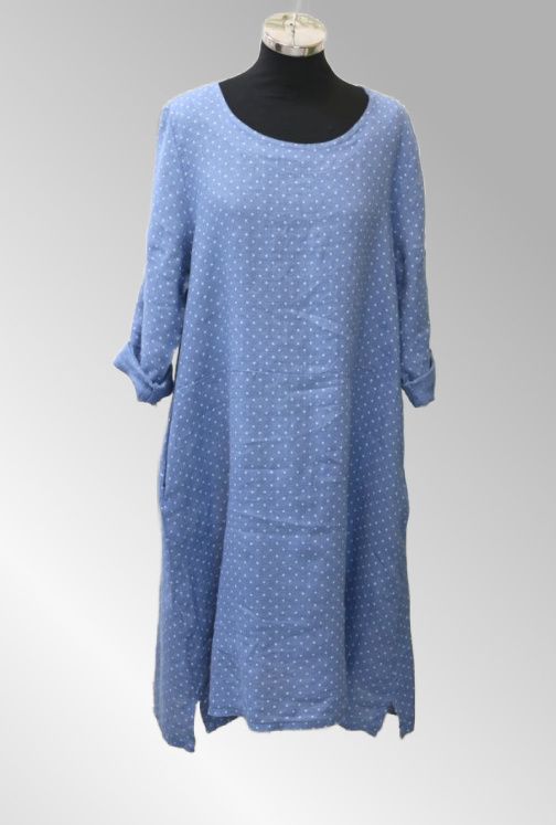 Smart hør kjole med prikker. 3/4 ærmer. Kjolen er i en fin blå farve med hvide prikker. Lommer i siden XS-XL Brystvidde