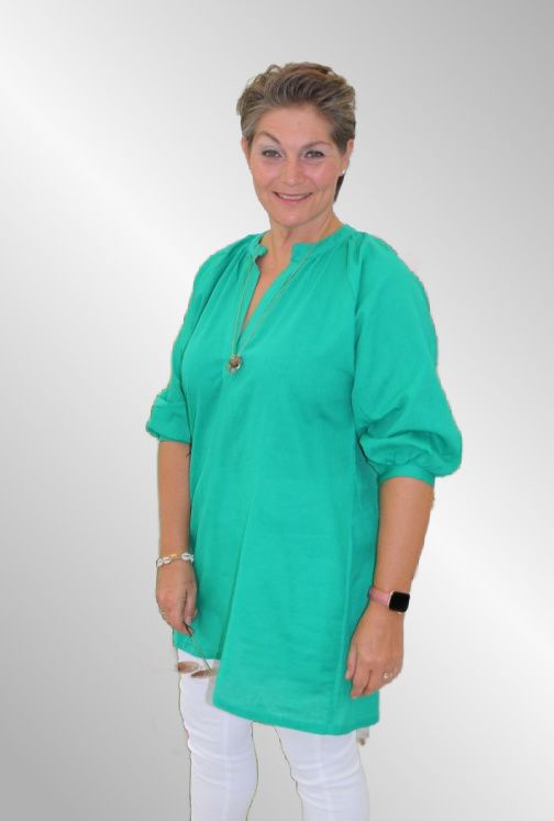 Fin tunika i god raglan facon, stolpelukning. 3/4 ærme, god længde og smuk grøn farve.