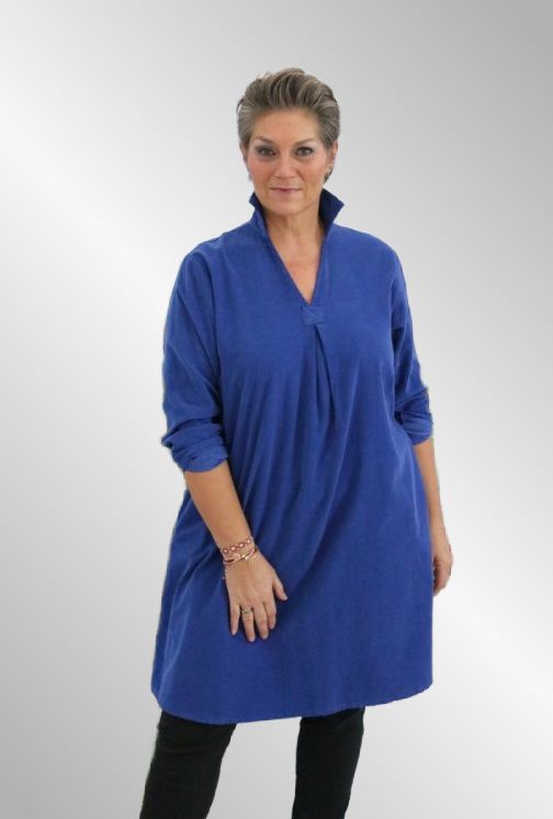 Dejlig rummelig kjole i babyfløjl, læg i ryggen, 3/4 ærmer, klassisk skjorte krave og lommer i siden