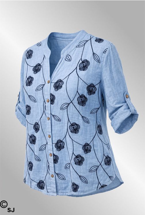 Let og behagelig hørskjorte med broderi på fronten. Perfekt til hverdag og ferie. V udskærring med lille krave, gennemknappet og med 1/2 ærme som kan sættes op i strop. Elegant og sommerligt udtryk, let at style til både bukser og shorts.