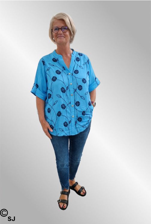 Let og behagelig hørskjorte med broderi på fronten. Perfekt til hverdag og ferie. V udskærring med lille krave, gennemknappet og med 1/2 ærme som kan sættes op i strop. Elegant og sommerligt udtryk, let at style til både bukser og shorts.
