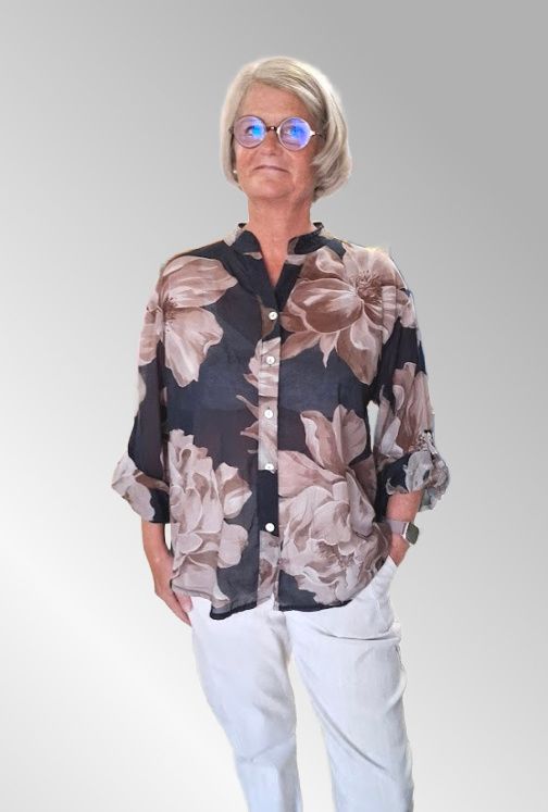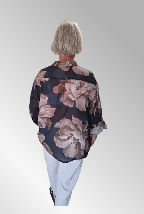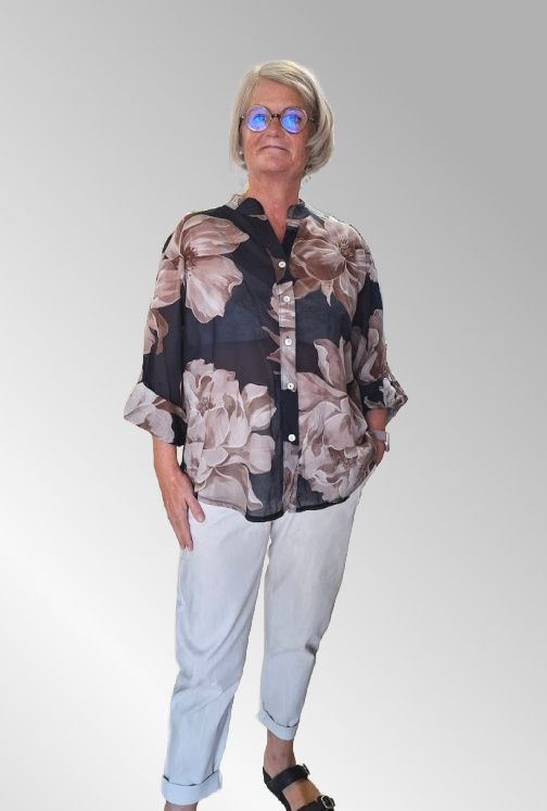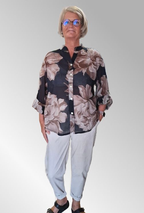 3/4 ærme med mulighed for strop, Kina krave. Skjorten er transparant og kræver en top under.