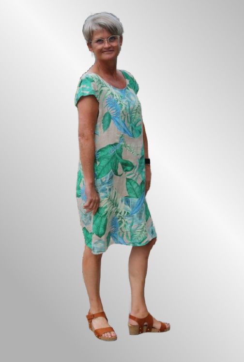 Skøn kjole i hør. Fantastisk snit med paneler af ribstof i samme print øverst i ryggen, som gør den sidder helt utrolig godt. En rigtig god farve med fint print.