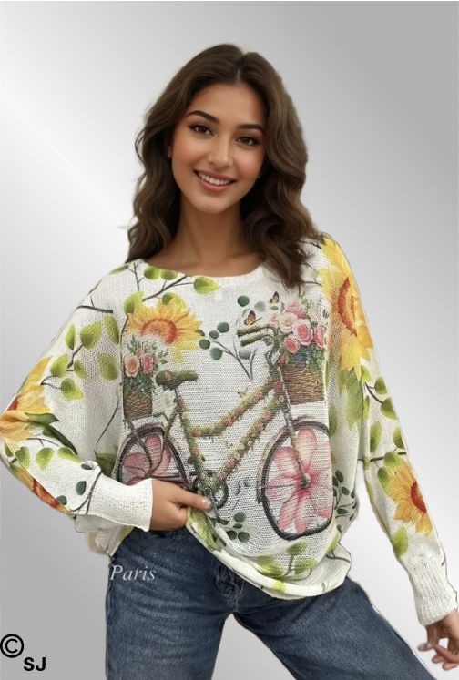 Let strik bluse med det fineste cykel og blomsterprint. Smukke farver. Lange ærmer og rund hals.