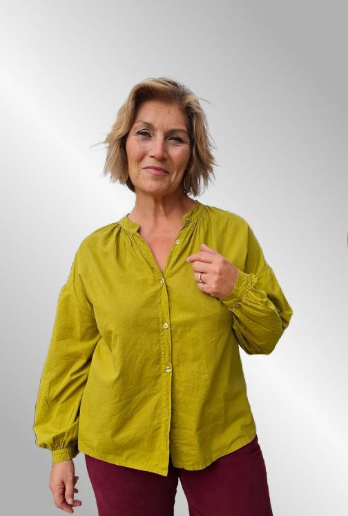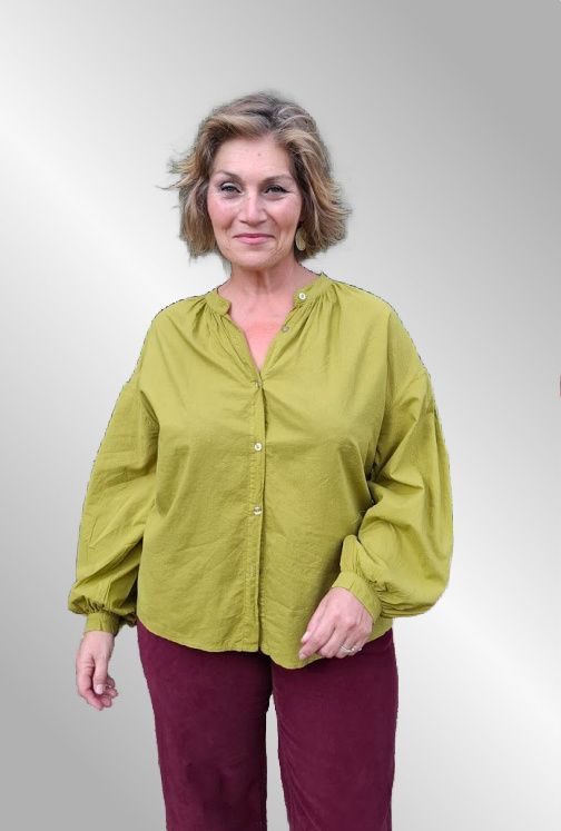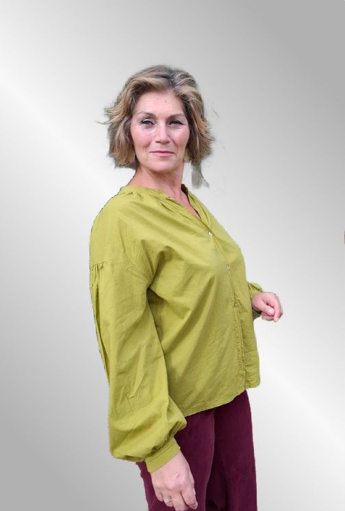 Lækker olivengrøn farve, bomuldsskjorte, gennemknappet.