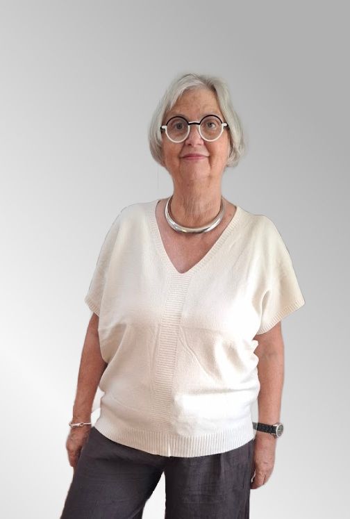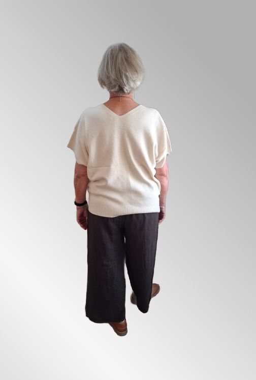 Lækker strik med korte ærmer og V hala både for og bag. Brug den evt over en skjorte i vinter, a la en vest.