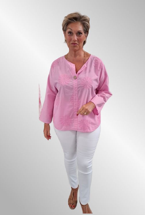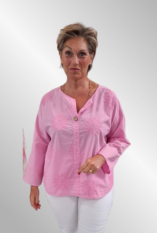 Bomulds skjorte med broder på forstykket. Stolpelukning, lange ærmer, afrundet i kanten.