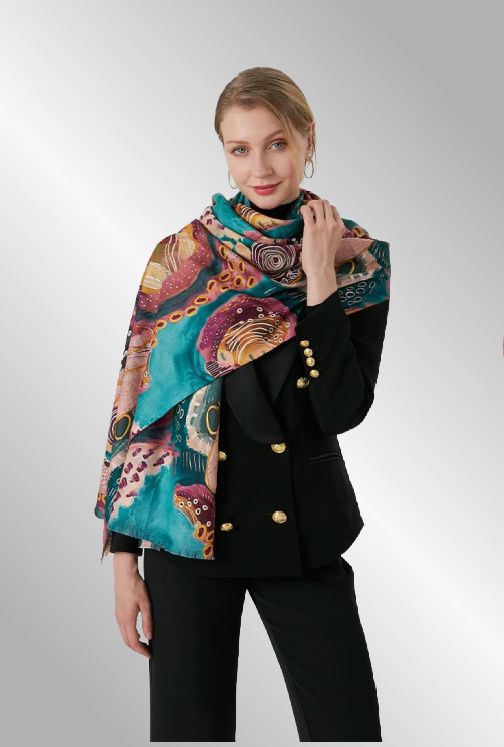 Meget smukt aflangt tørklæde i smukke farver, violet, brun og lidt guld på turkis baggrund. Blød og lækkert
