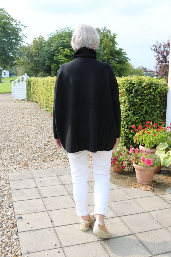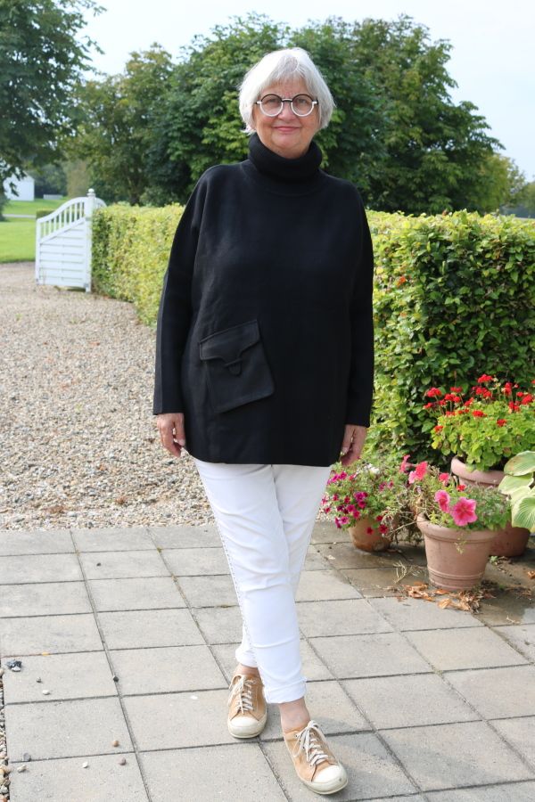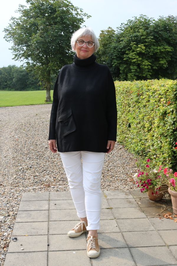 Lækker strik med høj hals, løs ikke stram hals. Lomme i skindlook.