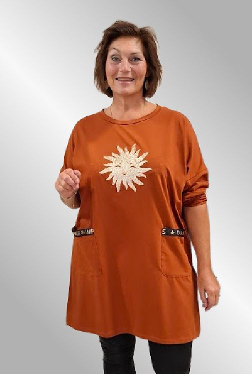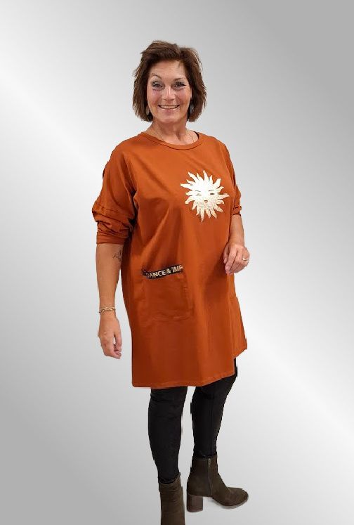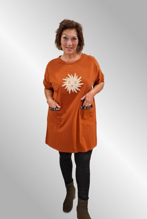 Bomulds tunika, med et fint print af en guld sol foran. Den har to påsyede lommer, lange ærmer og afrundet hals.