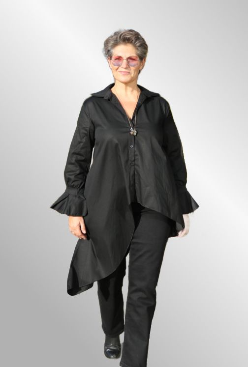 Sjov og smuk, klassisk sort skjorte med asymmetrisk snit. Trompet ærme, løst sort bælte medfølger.