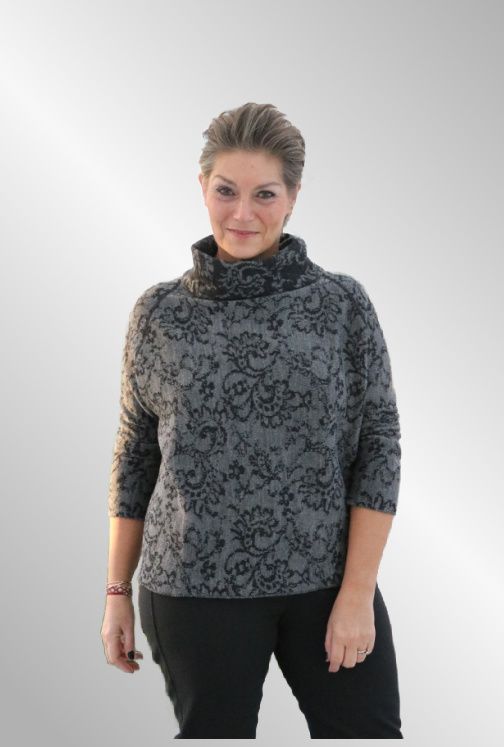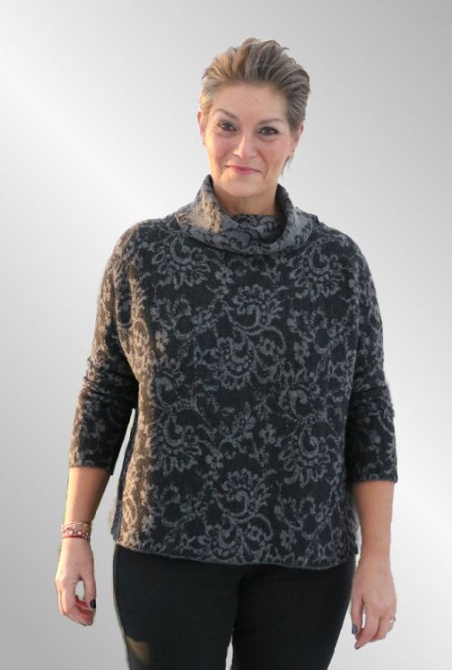 Total dejlig varm og skøn bluse i 100 % uld, smuk A facon og med hængekrave. Det helt unikke ved blusener , at den kan vendes om og blive omvendt i farverne, mest mørk og med lys mønster - det er da godt tænkt.