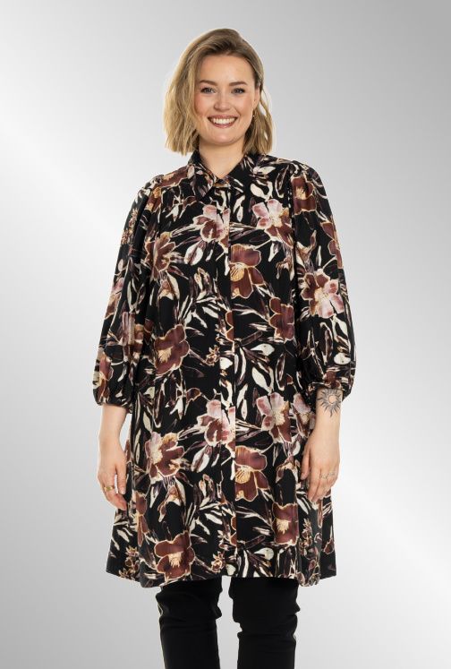 Smuk tunika, med 3/4 ærmer, bånd bagpå, den er gennemknappet, har klassisk krave og lommer i siderne.