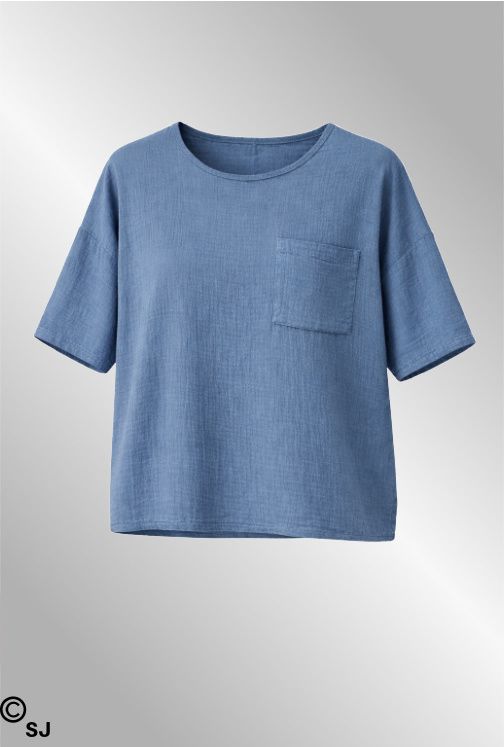 Total behagelig bluse i "ble bomuld" kort ærme og rund hals. Brystlomme
