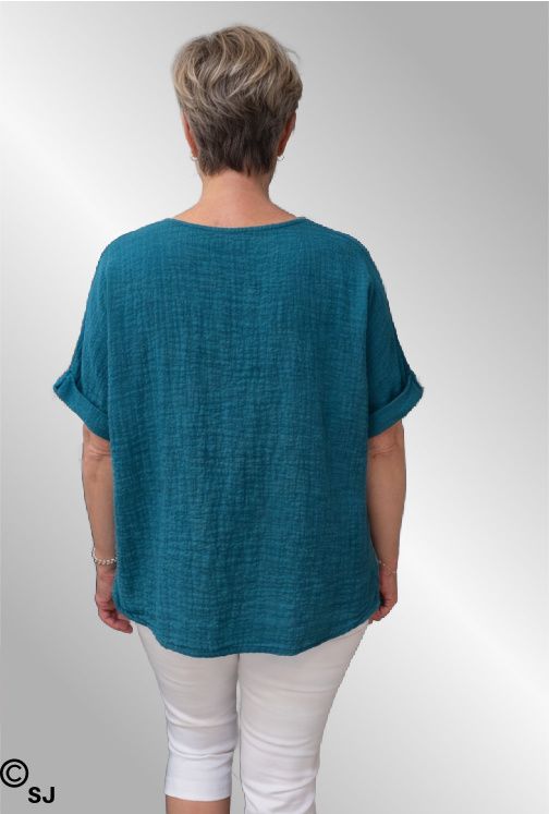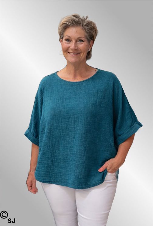 Bomuld /hør bluse med 3/4 ærmer og afrundet hals. Super let og lækker at have på.