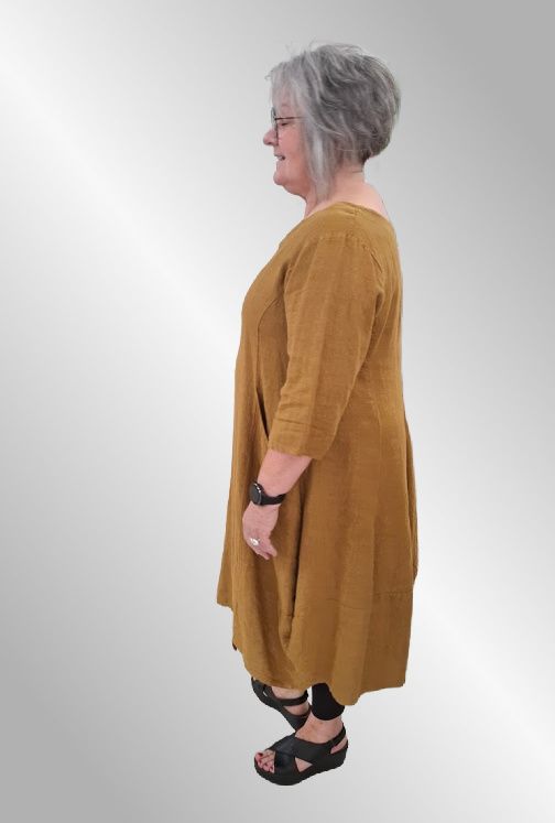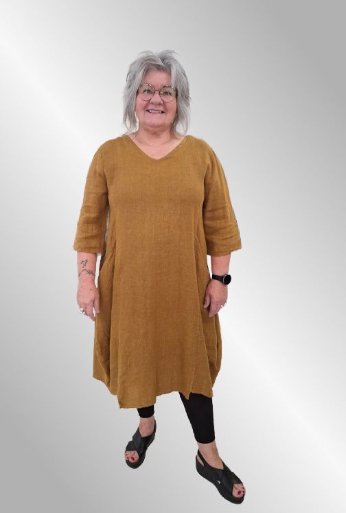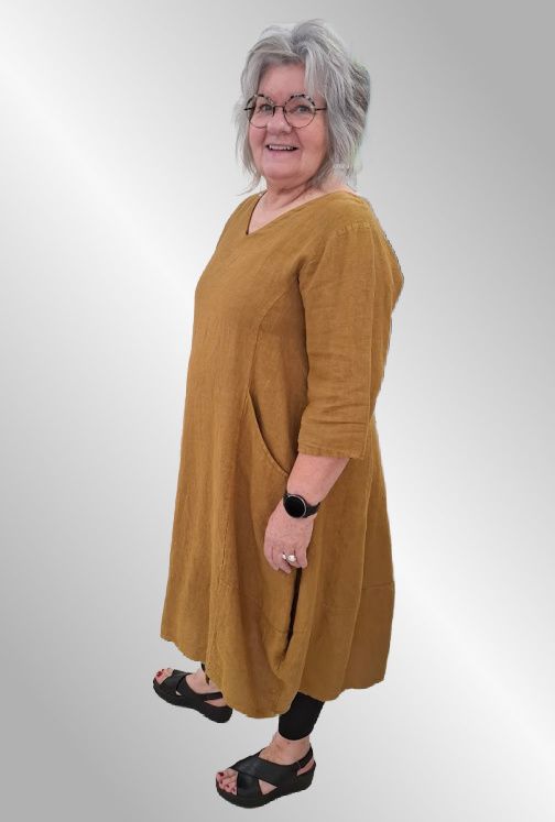 Lækker hørkjole i klassisk ballon snit, V hals, lommer, 3/4 ærme