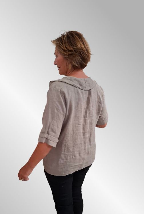 Lækker hørbluse i smuk Naturfarve, 3/4 ærme og krøl effekt foran.
