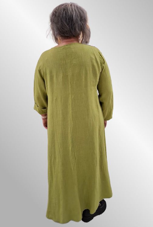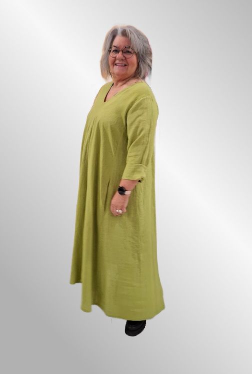 Behagelig maxikjole i 100 % hør, rummelig, stoffet er taget på skrå og derfor meget flexibel. V udskæring. Lommer i forstykket.