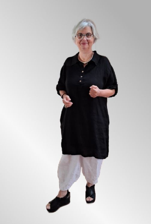 Klassisk sort hør unika / kjole med skjorte krave og stolpelukning med træknapper. Lommer ind i siden. 1/2 ærme som kan sættes op i strop
