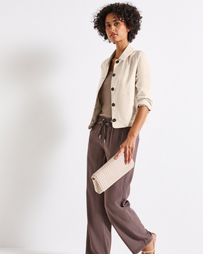 Perfekt jakke til indebrug i lækker vaskeskinds look. Gennemknappet, skjortekrave.