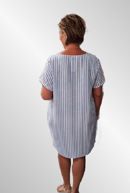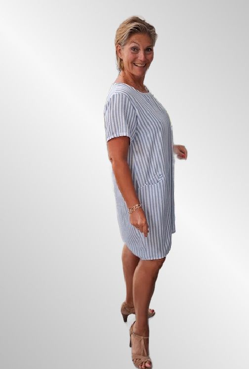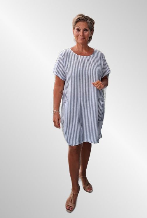 Let og luftig sommerkjole med mælkedrenge striber, korte ærmer og lommer fortil.