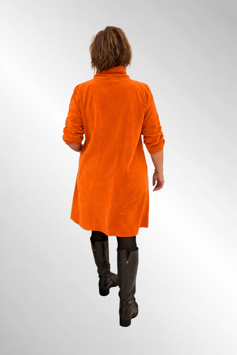 Lækker fløjlskjole med ståkrave. lange ærmer som kan sættes op i strop. Let A facon.