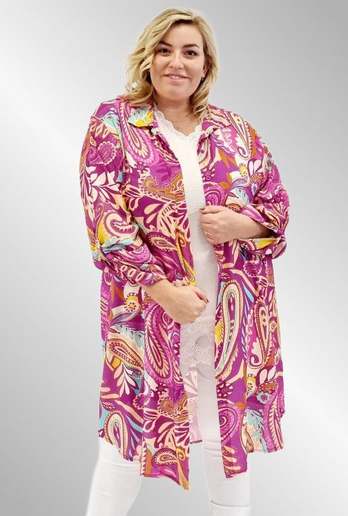 Lang skjorte i smukke farver, viskose, gennemknappet og med klassisk krave.Rundet i nederste kant.