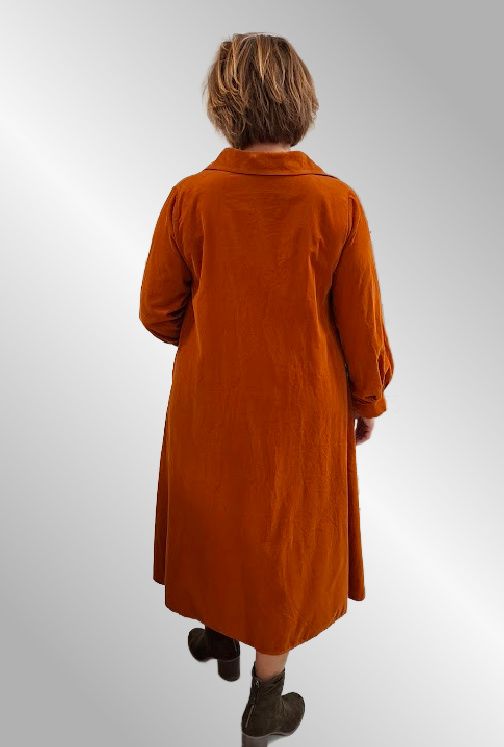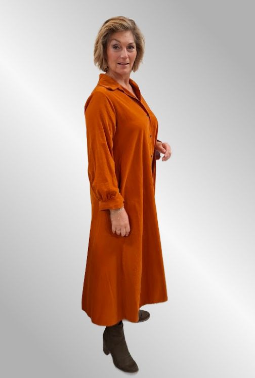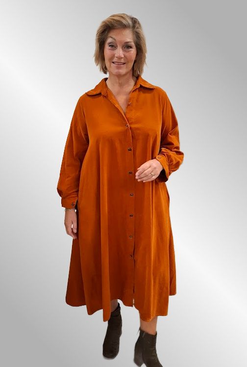 Lang fløjls skjorte/kjole i A facon, gennemknappet, skjulte lommer i siden og med klassisk krave.