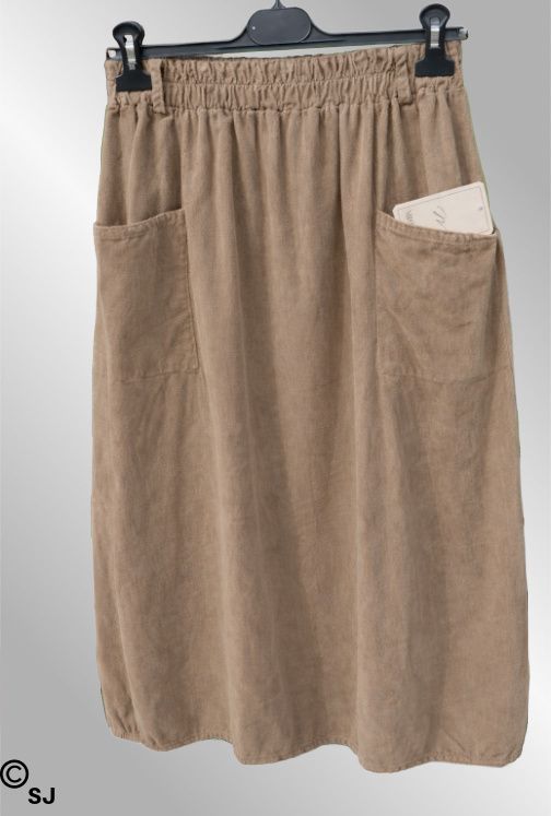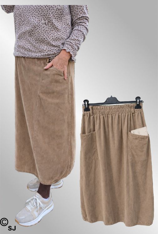 Nederdel i babyfløjl, bred elastik i taljen, lommer. bæltestropper.