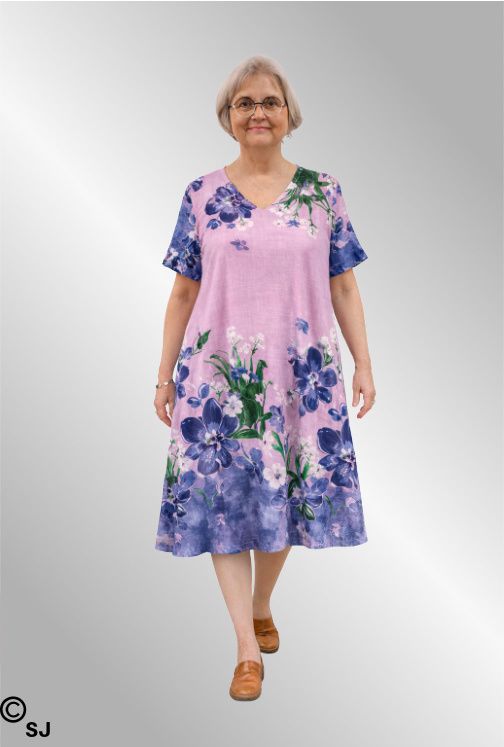 Smuk og let kjole i blød bomuld med dekorativt blomster print, Let A facon, korte ærmer og feminin V hals, som giver en behagelig og luftig pasform. Pe praktiske lommer i siderne gør den både stilfuld og funktionel. Perfekt til både hverdag og sommerens arrangementer.