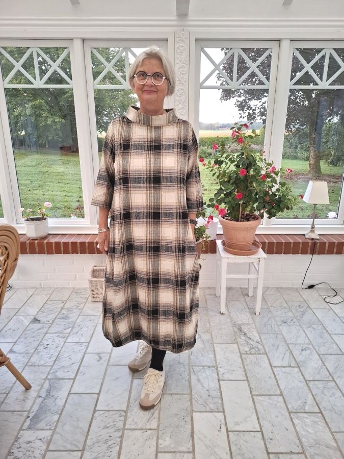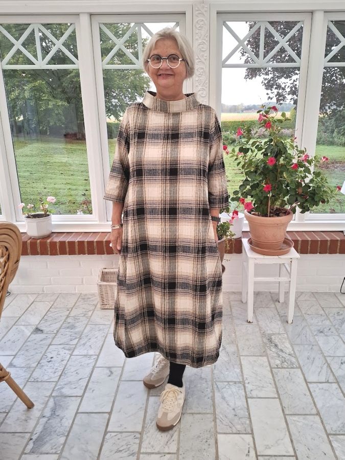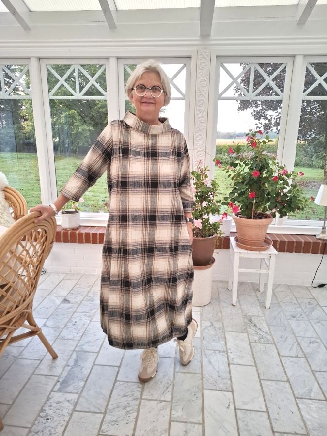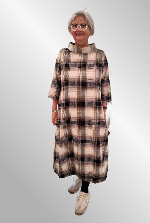 Lækker maxikjole i råhvid / blå / beige tern. Ståkrave, 3/4 ærmer og lommer i siden.