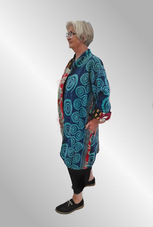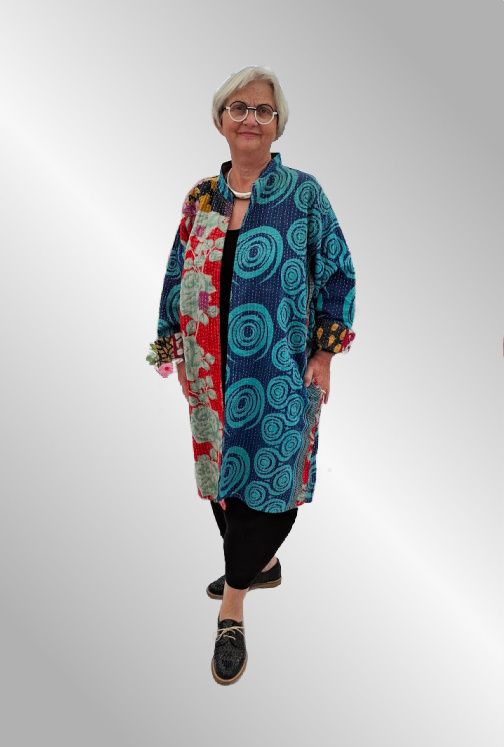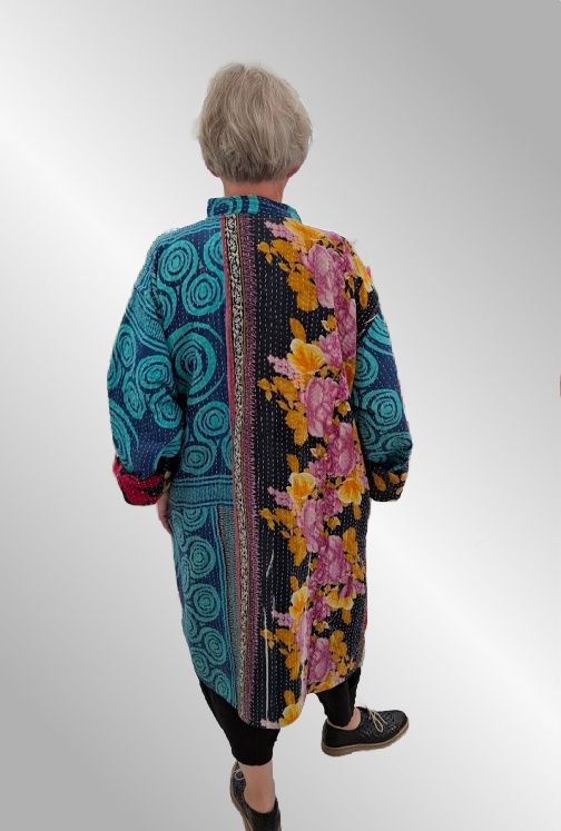 Jakken er fremstillet af gamle tæpper fra det nordlige Indien. to lag stof quiltet sammen efter gammel japansk teknik og med bomulds for imellem.