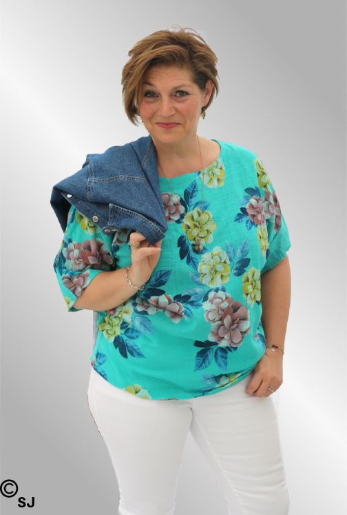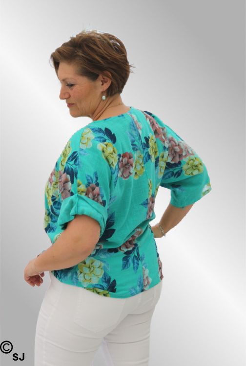 Virkelig fin og behagelig blomstret bluse, rund hals og 3/4 ærme