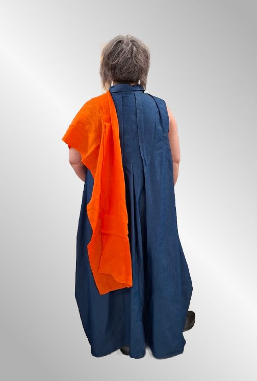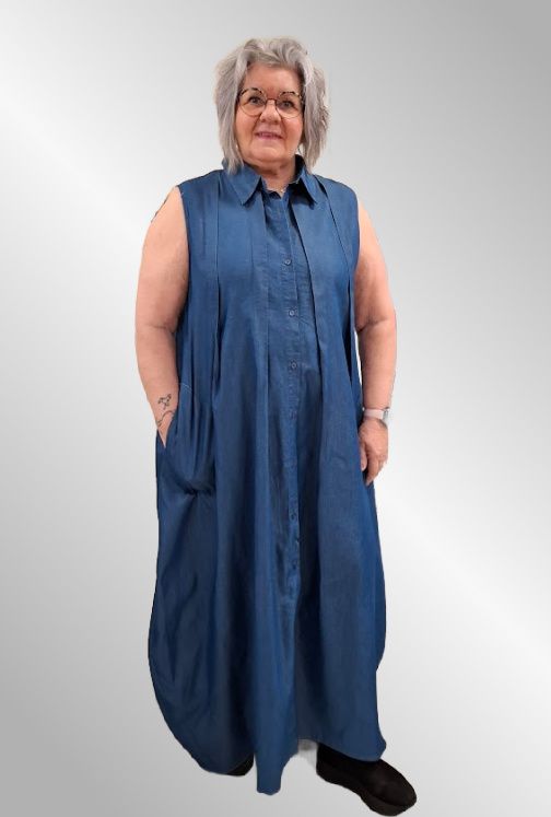 Smuk denimskjortekjole uden ærmer, gennemknappet. Brug den evt som lang vest. Lommer og krave.