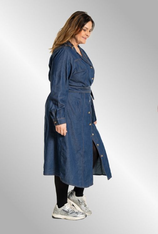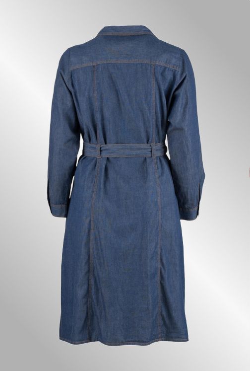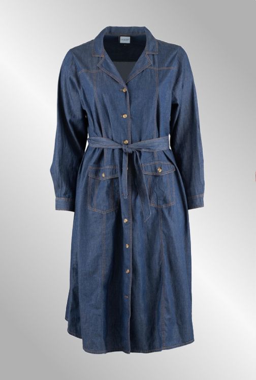 Lang denim skjortekjole, gennemknappet, v hals og Skjortekrave. Lommer i siden. Bindebånd medfølger.