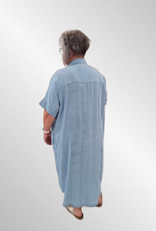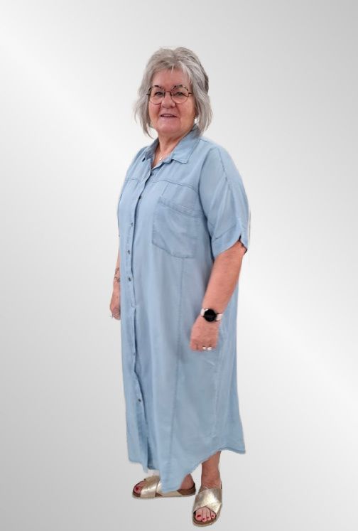 Lækker denimkjole i lang, gennemknappet og med klassisk skjortekrave. One size