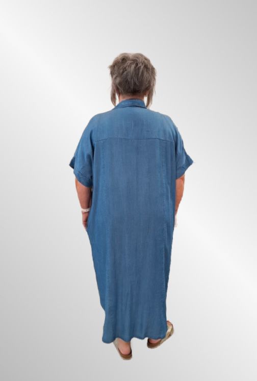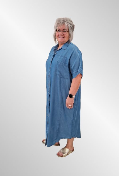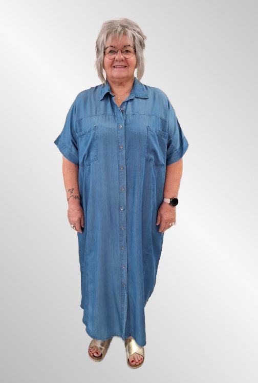 Lækker denimkjole i lang, gennemknappet og med klassisk skjortekrave. One size
