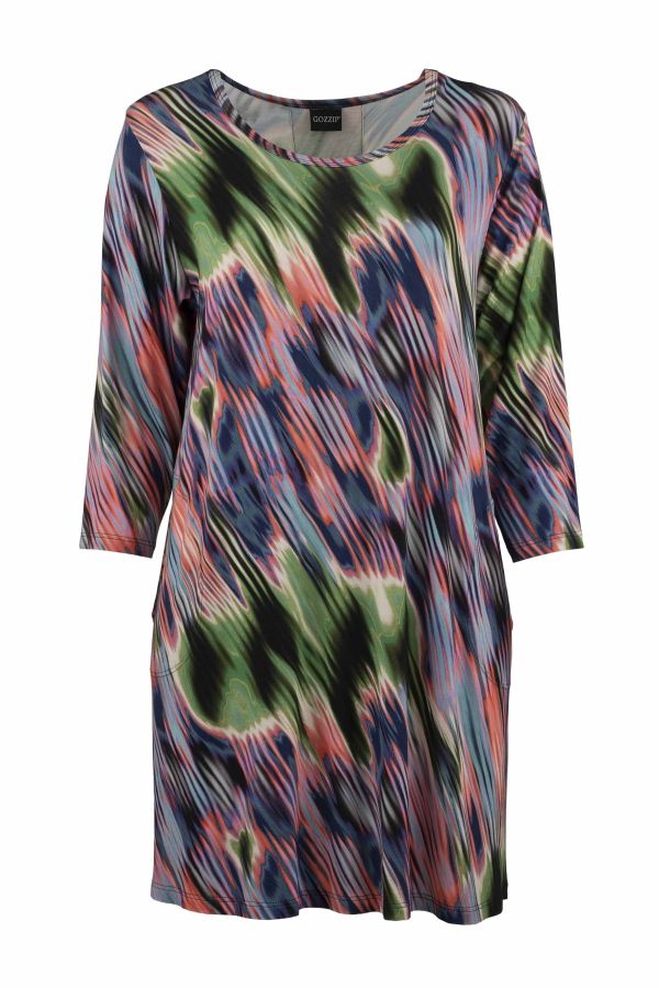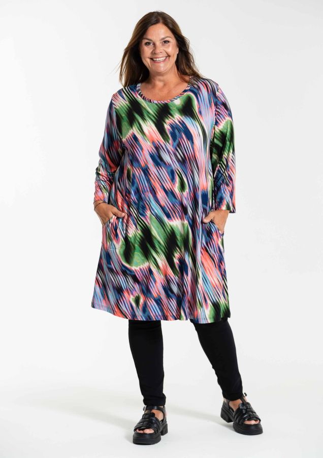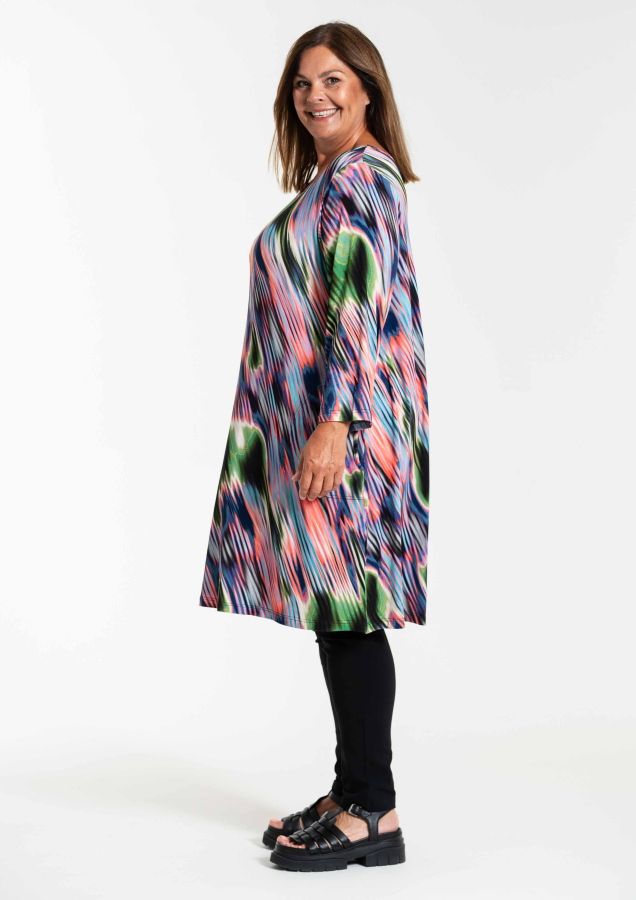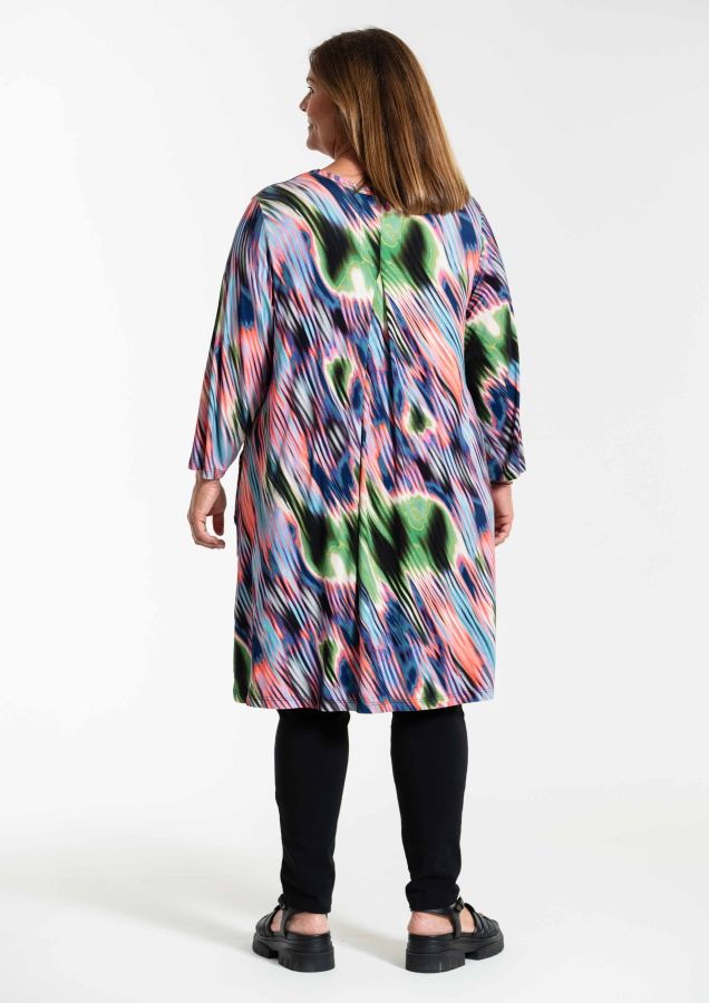 Farverig tunika kjole i lækker blød viskose jersey, rund hals og 7/8 ærmer, læg i ryggen.