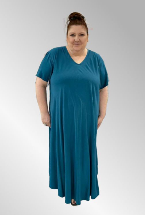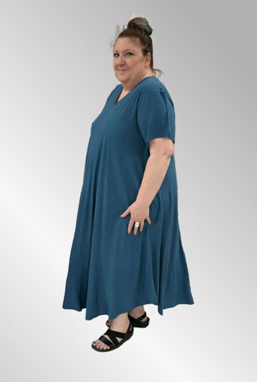 Let og lækker viskose kjole i flot A facon. V hals og korte ærmer.