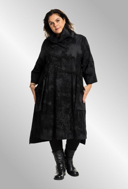 Fin kjole med hængekrave, en skæring foran og store lommer på fronten. Den er længere bagtil end foran.