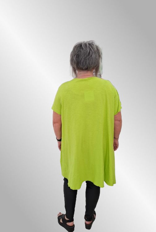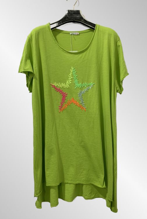 Lime T-Shirt med broderi på fronten. Rund hals og kort ærme, længere bag end for. Rulle kanter