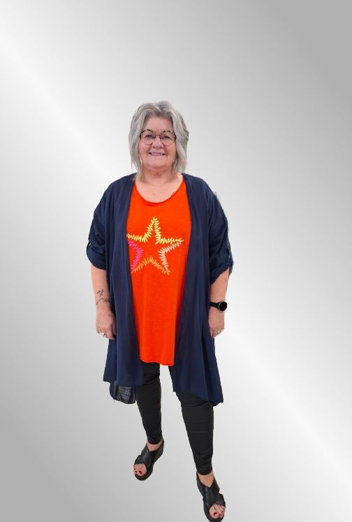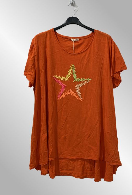 Orange T-Shirt med broderi på fronten. Rund hals og kort ærme, længere bag end for. Rulle kanter