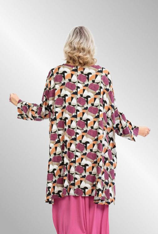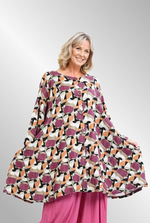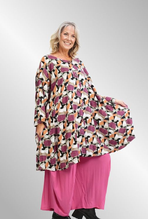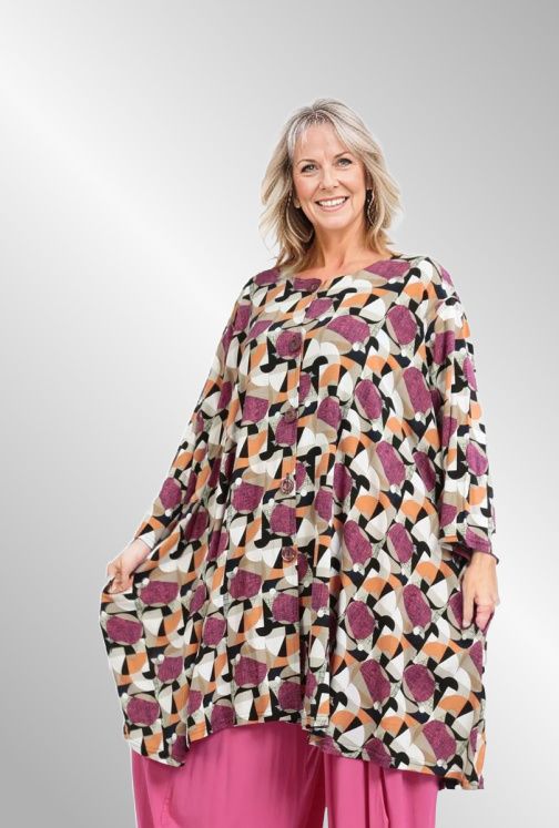 Smuk tunika jakke i afstemte farver, gennemknappet, rund hals, 3/4 ærme.