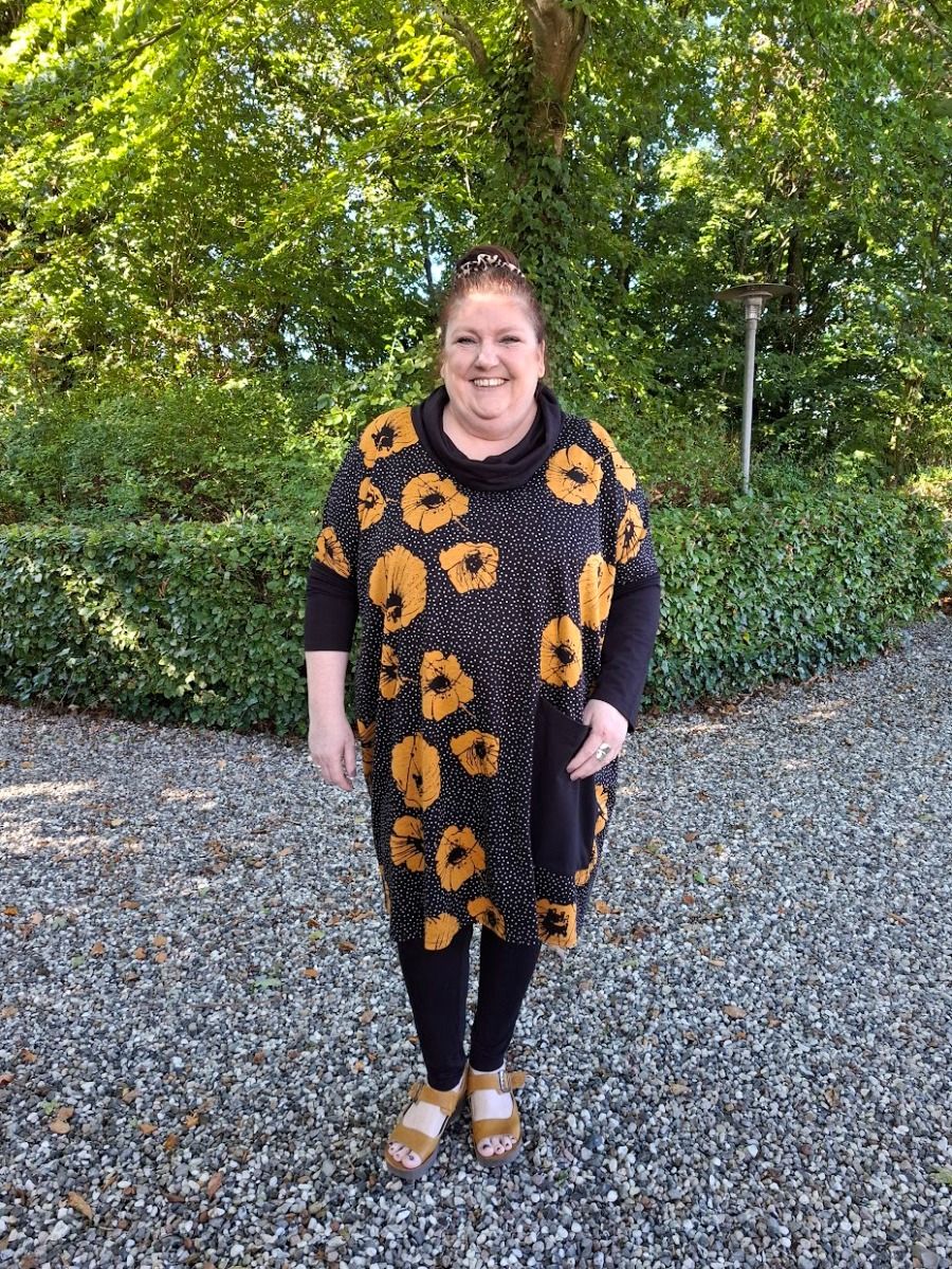 Sort tunika med hængekrave, gule blomster, AKH 6807-2