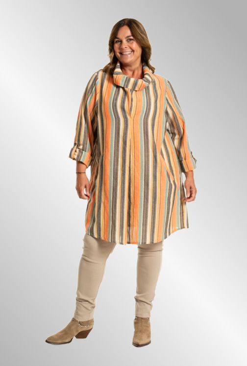 Fin tunika med lodrette striber i brændte farver. Hængekrave, 3/4 ærmer og lommer.