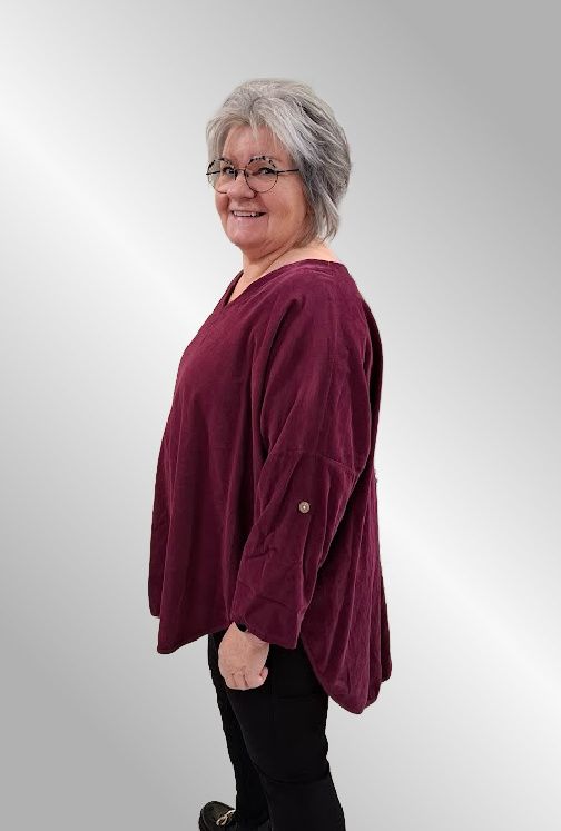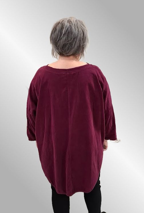 Fløjlsbluse med 3/4 ærmer og V hals. Den er afrundet forneden, og længere bagpå end foran.