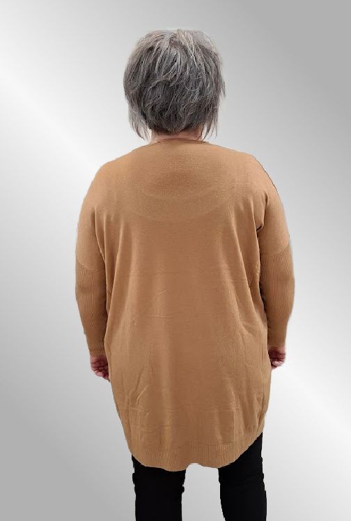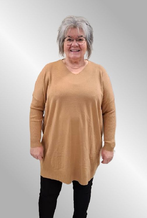 En super lækker lang strik, kvaliteteten er smørblød og med en masse lækre materialer. Den er så behagelig at have på. Den er med V hals og ribærmer. Den er strækbar og dækker flere størrelser. Længere bagpå end foran.