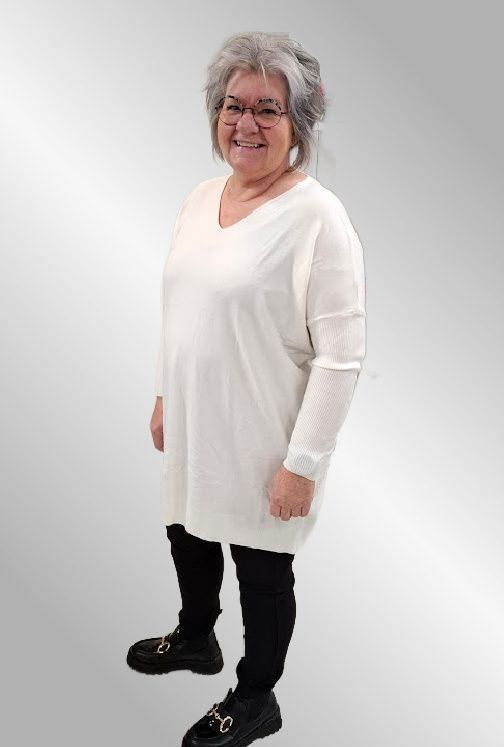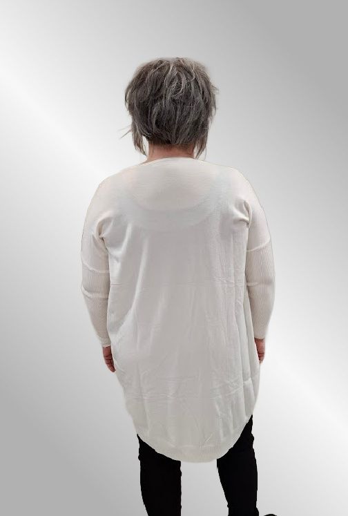 En super lækker lang strik, kvaliteteten er smørblød og med en masse lækre materialer. Den er så behagelig at have på. Den er med V hals og ribærmer. Den er strækbar og dækker flere størrelser. Længere bagpå end foran.