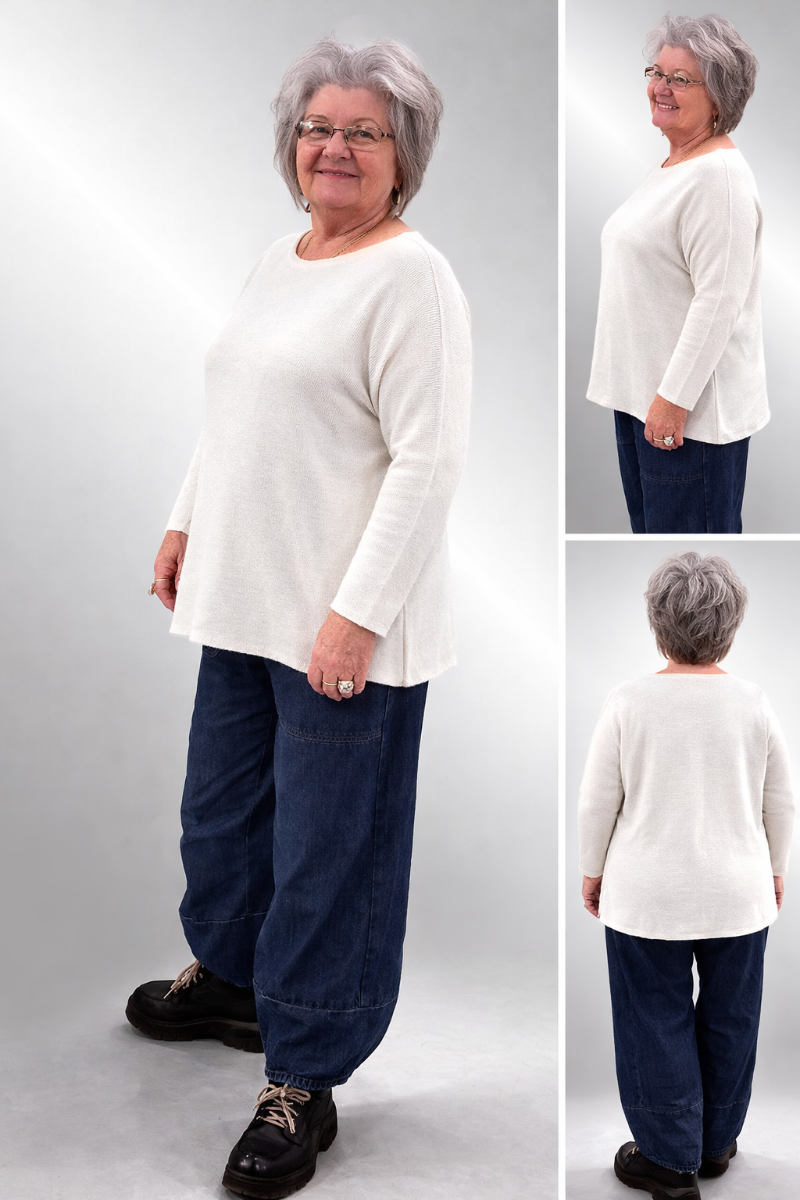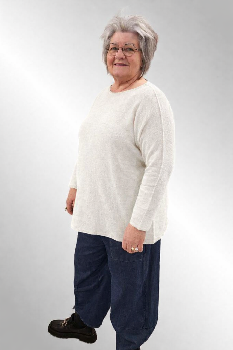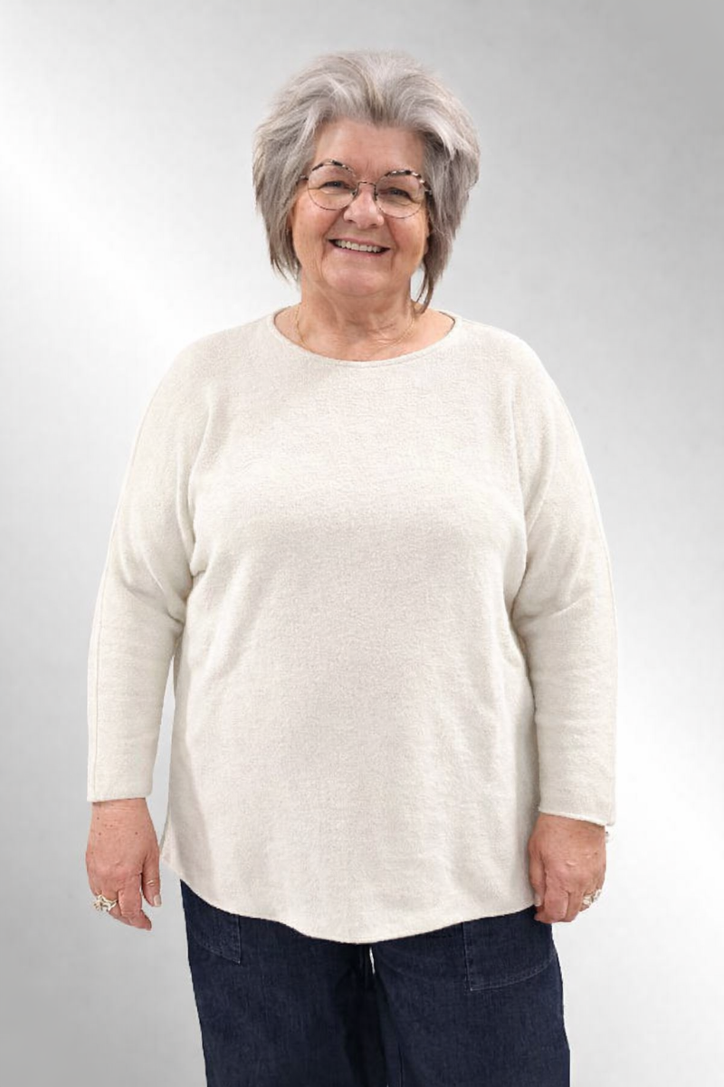 Enkelt, behagelig strikbluse i lækker blød kvalitet. Strikket på tværs, rund hals